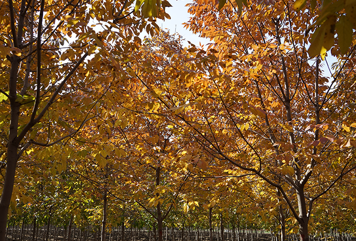 秋紫白蠟Fraxinus americana‘Autumn Purple’,木犀科梣屬。喜光、耐寒,耐鹽堿、萌蘗力強,生長快;落葉小喬木,葉片較大,最大可達15cm;葉脈較突出,緣有希鋸齒;葉色10月初變為紫紅色,鮮艷美麗,彩葉期可持續半個月左右;我國東北南部、華北、華東、中南至西南地區區域內均可生長。